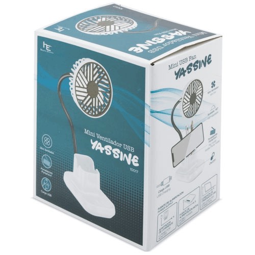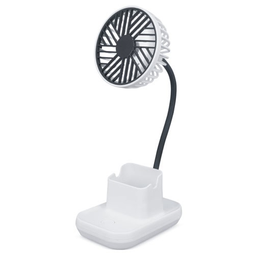 O ventilador ajustável 180º, tem um acumulador de carga na qual permite o funcionamento sem estar em modo de carga. Com alojamento para colocar o telemóvel. Inclui cabo de carga.