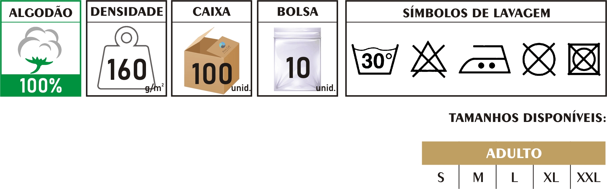 T-shirt de 100% algodão ring spun. 160 grs/m2 malha liso. Gola em bico canelado. Reforço nos ombros...