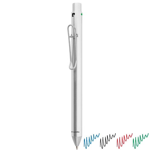 Esferográfica de metal com textura de alumínio e abertura giratória. Escrita azul. Fornecida em esto..