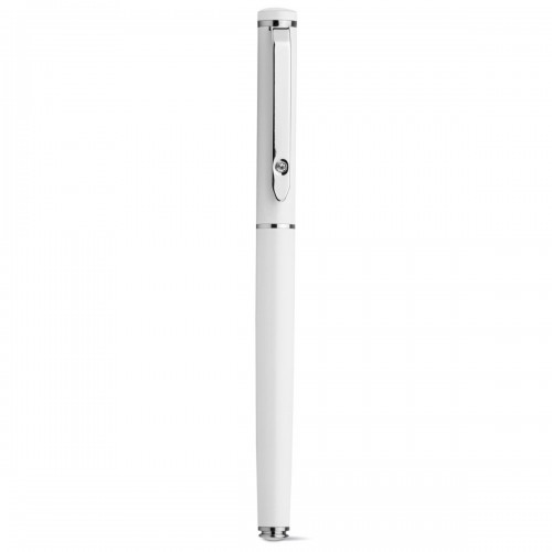 Roller em metal com clip e apontamentos em dourado. Escrita azul. Fornecido em estojo em papel kraft..