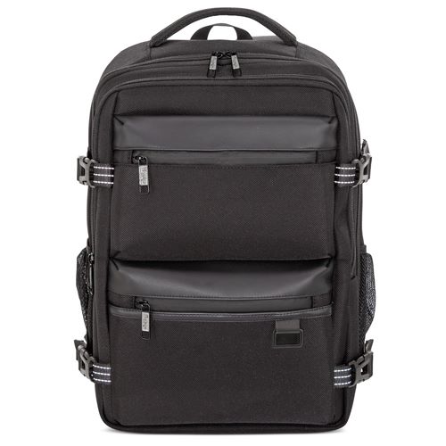 Possui um bolso traseiro antirroubo oculto, um interior espaçoso com compartimento almofadado para portátil (até 17"), bolsos frontais de acesso rápido e bolsos laterais para garrafas de água.