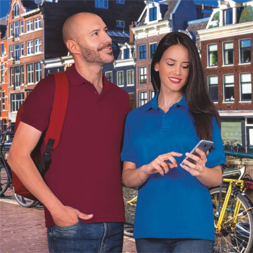 Pólo 100% poliéster 170 grs/m. Tecido transpirável e de secado rápido. Gola polo e remate de ma..