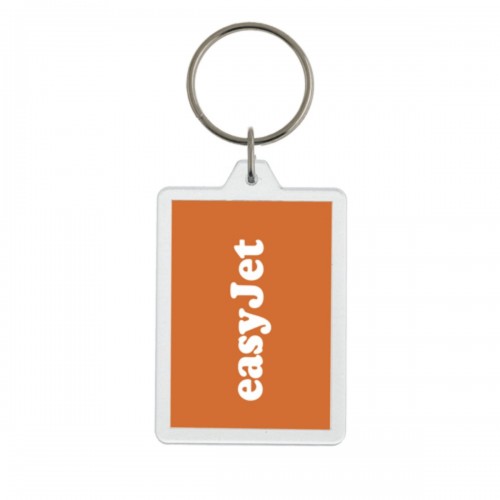 Porta-chaves em acrílico, formato retangular. Personalizado com inserção de papel em 2 faces (35x50mm) e tampa em acrílico. (Vendido em múltiplos de 100 pcs)