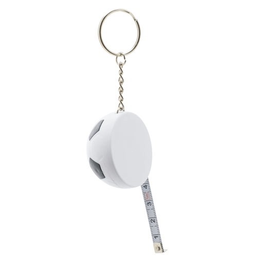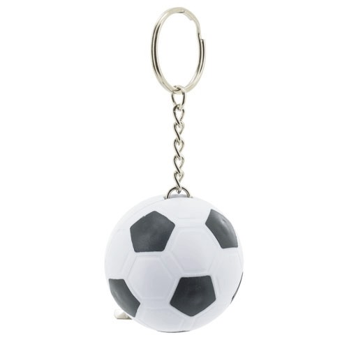 Porta-chaves com forma de Bola de Futebol. Medida de 1 metro. Fita flexível, Auto recolha. Para o seu uso é necessário pressionar botão para extrair e recolher a fita métrica.