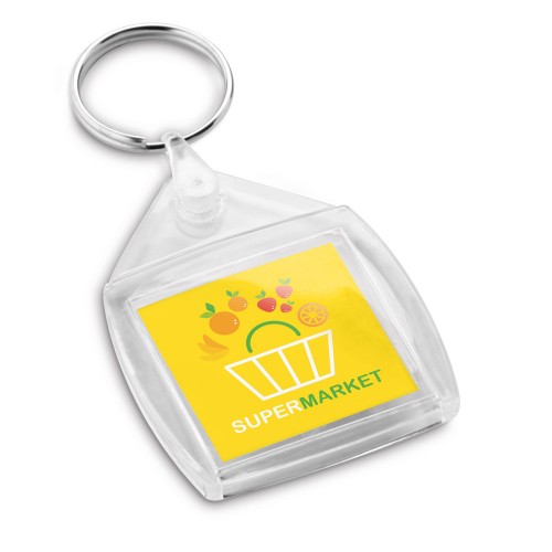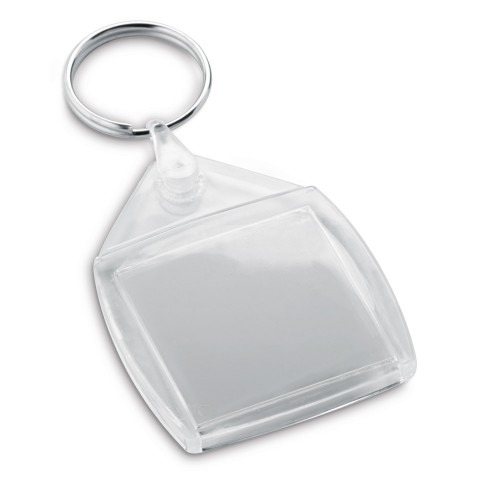 Porta-chaves em PS transparente com formato retangular. Produto fabricado na Europa. 35 x 58 x 6 mm..