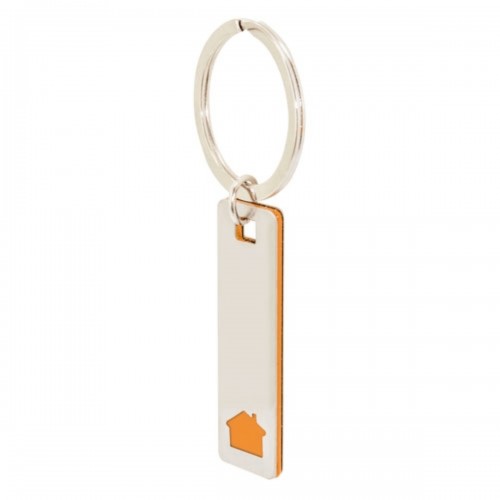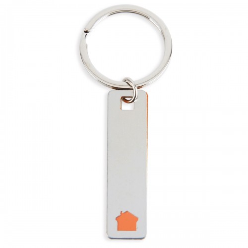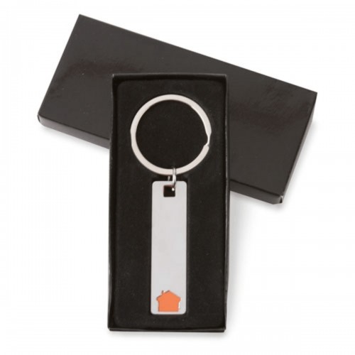 Porta chaves metálico com detalhe de uma casa. Ambos os lados iguais. Fornecido em caixa individual. Medidas do porta chaves: 1,5 x 5,5 cm.