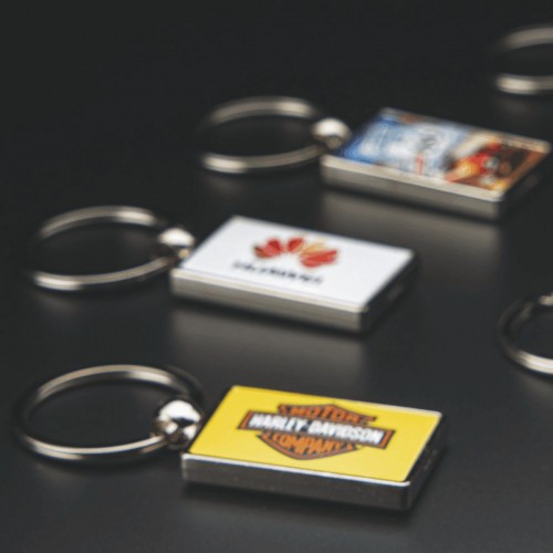 Porta-chaves SM-40D em metal, com formato retangular. Personalizado em 2 faces com inserção de papel (25x40mm), e tampa em acrílico. 2,5 x 4 cm