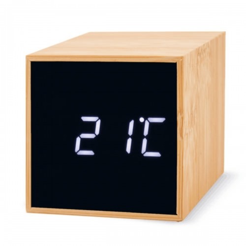 Relógio despertador em bambu. Função hora, alarme, calendário e temperatura. Mostra de forma alternada hora, temperatura e data. Cabo incluído. 63 x 63 x 63