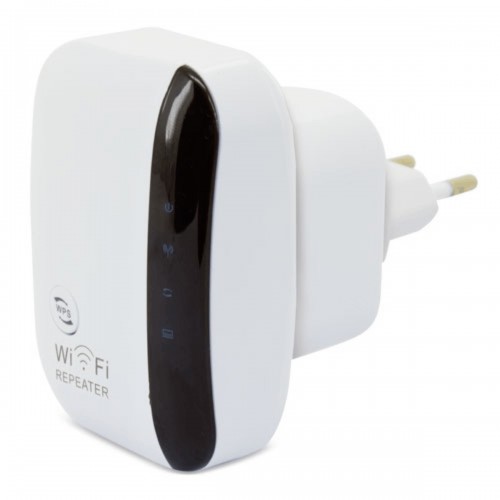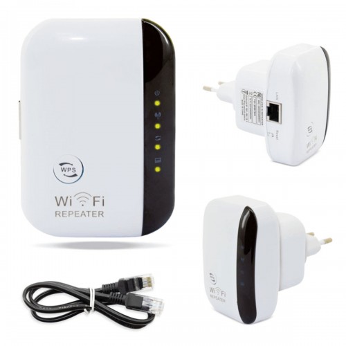 Repetidor de sinal WiFi, que amplifica o sinal por toda a sua casa ou escritório. Alta velocidade (300 Mbps) e botão WPS para fácil instalação. Cabo LAN incluído. Dimensão do Repetidor: 5,3 x 8 x 5,8 cm.