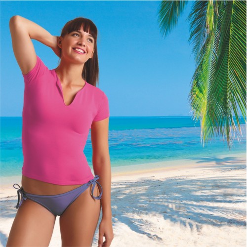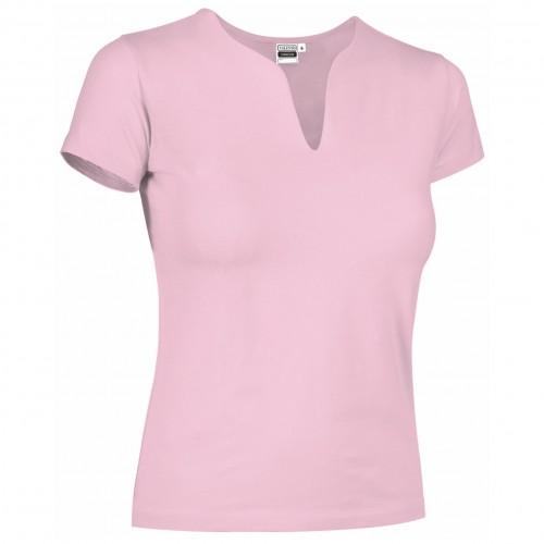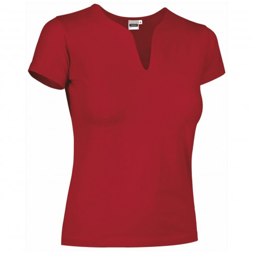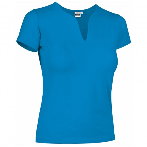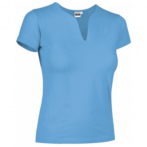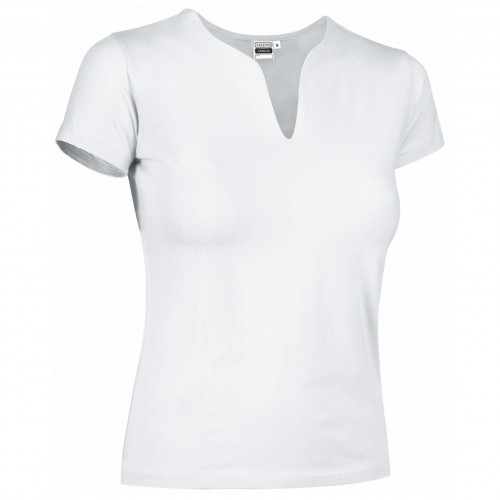 T-shirt de manga curta para mulher, corte estreito, e abertura em forma de lágrima na gola. Confecionada em tecido de malha de algodão ring spun com elastano suave, confortável e flexível. Costura dupla na bainha e mangas que aumenta a sua resistência.