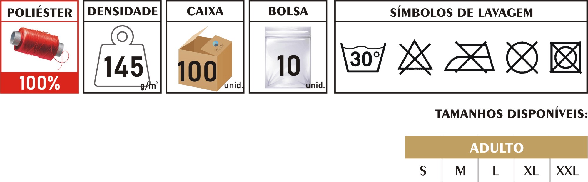 Costuras planas nas cavas, mangas e laterais para minimizar a fricção contra a pele. Métodos adequados de marcação: sublimação sobre branco, serigrafia, bordado, transfer, vinil. Ideal para atividades físicas e como roupa desportiva.