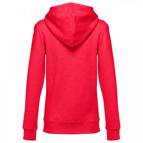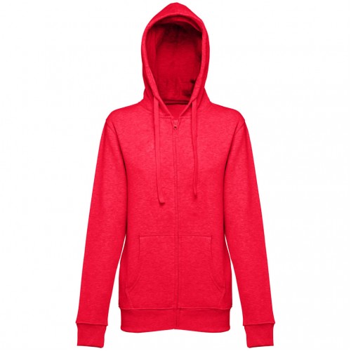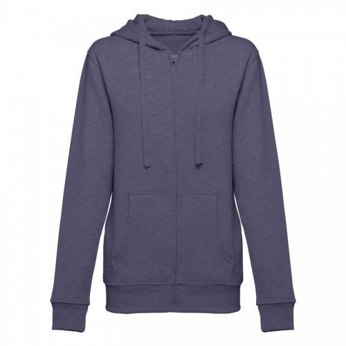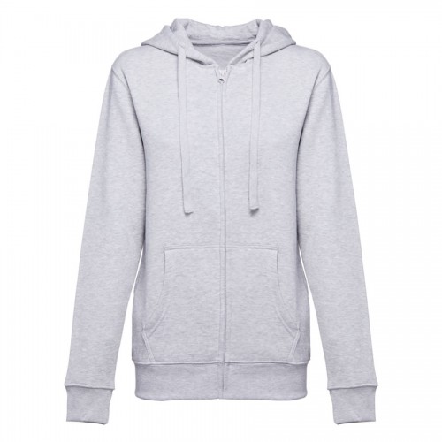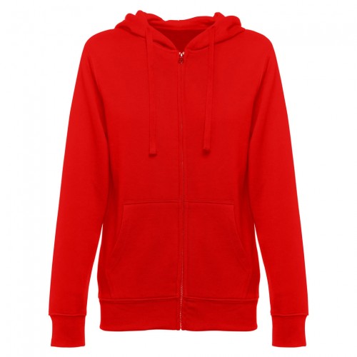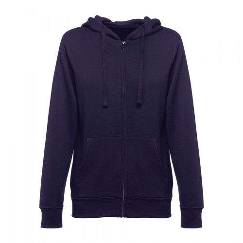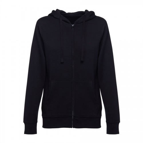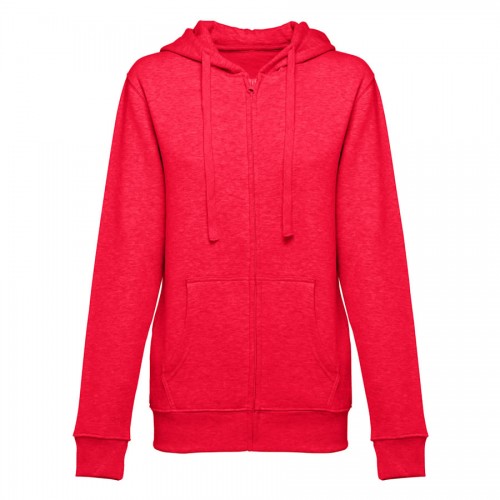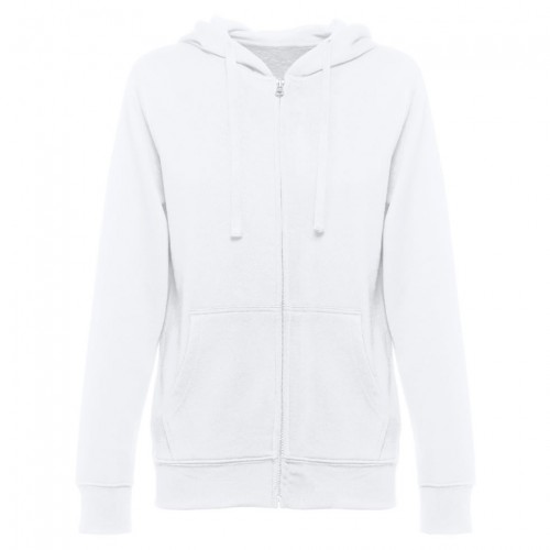 Sweatshirt com fecho e capuz para mulher - 320 g/m2. 50% algodão, 50% poliéster. Capuz forrado com cordão de aperto à cor.